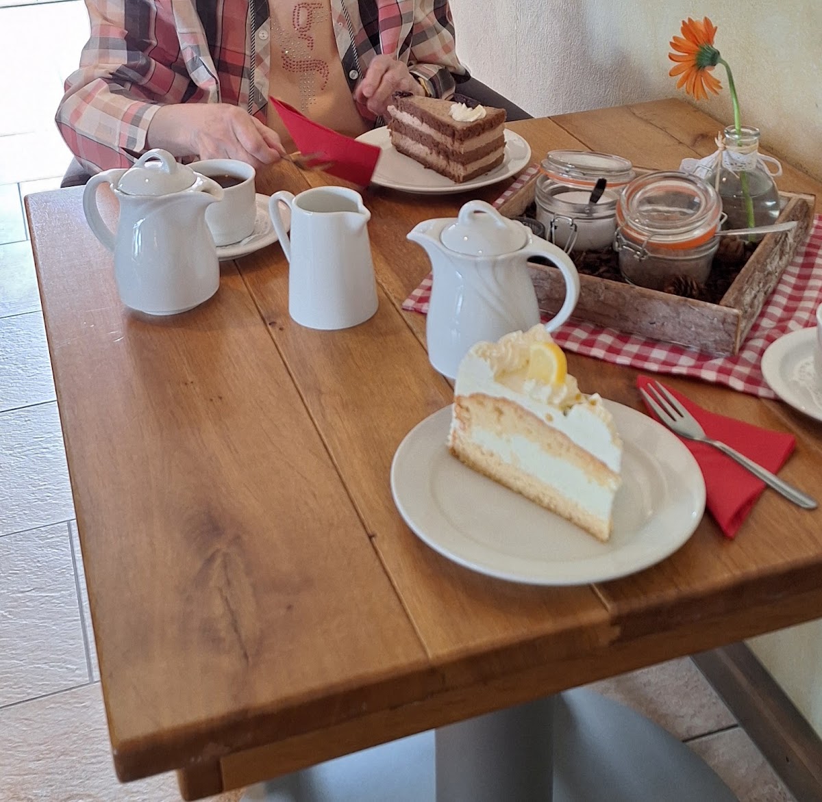 Breakfast here is a highlight, especially on mornings when it’s not crowded enough to keep the buffet behind a counter — then it’s brought to your table, offering plenty to choose from, including options that accommodate vegetarian preferences. Coffee comes in basic forms included with the meal, with extras like latte macchiato or cappuccino available for a small additional cost. Afternoon visits shift focus to the café’s selection of softly textured, house-made cakes and tortes, which tend to be creamy without feeling heavy, making for a perfect mid-day treat alongside well-poured coffee.