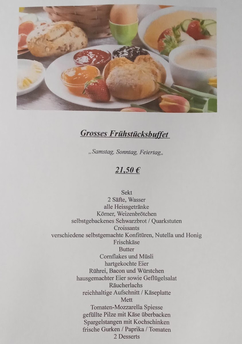 The menu at this cafe primarily offers a selection suitable for breakfast, coffee breaks, and light meals. Visitors can expect options that include a breakfast buffet with various egg preparations, cold cuts, cheese assortments, muesli, and preserves. Beverages such as coffee and fruit juices are available as part of the breakfast service, with specialty coffee drinks like Latte Macchiato or Cappuccino offered at an additional charge.